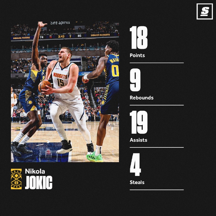 赛后看球员表现,掘金约基奇出战 38 分钟,14 投 9 中,得 18 分 9 篮板 19 助攻 4 抢断,助攻数创生涯新高。戈登 17 投 11 中得 25 分 5 篮板,穆雷三分 4 中 4 得 16 分 6 助攻,小波特 19 分 11 篮板。步行者特纳 23 分,哈利伯顿 19 分 15 助攻,西亚卡姆 19 分 9 篮板。